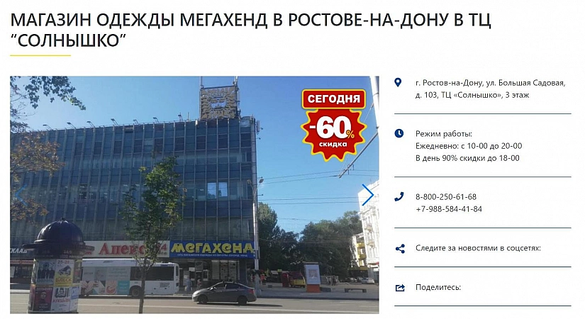 MEGA-HAND-butiken är med rätta erkänd som en av de bästa i Rostov-on-Don. Här hittar du ett enormt utbud av T-shirts, kjolar, skjortor, byxor, barnkläder, skor och accessoarer. Dessutom kommer allt detta att läggas snyggt ut på hyllor eller hängas på galgar efter kategori med en indikation på storleken. Detta gör det enkelt att navigera begagnat. Köpare älskar denna plats först och främst för bra priser - inom 14 dagar efter leverans minskas varukostnaden gradvis tills rabatten når maximalt 90%. Men trots att utbudet här är riktigt stort är nya märkesvaror sällsynta. Dessutom är de omedelbart slutsålda och de håller inte förrän dagen för maxförsäljningen.
