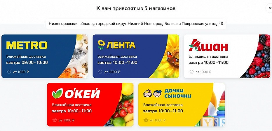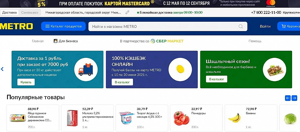 Det finns en Metro-butik i många stora städer, inklusive Nizhny Novgorod. Det uppskattas av köpare för ett stort utbud av varor och förmånliga priser. Och samarbetet med Sbermarket gjorde det möjligt för butiken att snabbt leverera mat och andra varor till kunderna hemma. Du kan lägga en beställning direkt på hemsidan eller genom applikationen från din smartphone. Leveranstjänsten fungerar sju dagar i veckan, köp levereras till kunder före kl 23:00 efter överenskommelse. Minsta beställningsbelopp är 1000 rubel, medan tjänsten kommer att kosta 149 rubel. Om köpet visade sig vara mer än 7 000 rubel, behöver du bara betala 1 rubel för leverans. Dessutom kan den genererade beställningen hämtas från avhämtningsstället. En av de få nackdelarna som kunderna anser är högre priser på dagligvaror jämfört med andra stormarknader i staden.