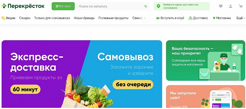 Livsmedelsleveranstjänsten från Perekrestok supermarket är särskilt populär på grund av avsaknaden av ett lägsta beställningsbelopp och ett stort urval av varor.