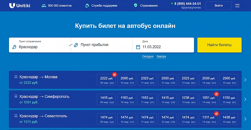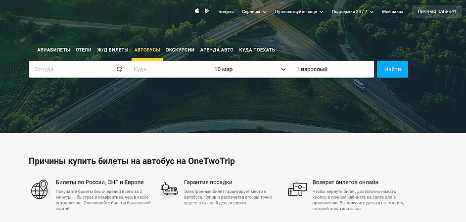 En annan lönsam, pålitlig och bekväm tjänst för att köpa biljetter för alla typer av transporter. Du kan verkligen boka vad som helst via sajten: en plats på en buss, tåg, flyg och till och med hyra en bil. Systemet låter dig även boka hotell, boka utflykter och turer. Hittills är mer än 7 000 bussbolag och mer än 30 000 rutter i Ryssland, Europa och OSS tillgängliga för användare. Om vi pratar om bristerna, men de är typiska för sådana organisationer: supportpersonalen är inte särskilt snabb att svara på förfrågningar, plus att de inte har bråttom att returnera pengarna när de gör en retur.