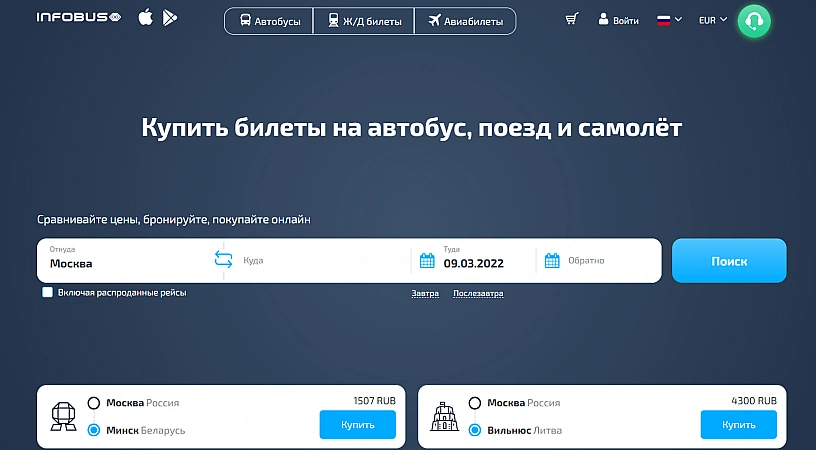 En annan multifunktionell onlinetjänst där du kan köpa en biljett till buss, flyg eller tåg. Det är enkelt att göra en beställning via hemsidan eller mobilapplikationen - ange bara lämpliga datum, jämför priser och välj det bästa erbjudandet. Infobus supporttjänst fungerar dygnet runt, men av recensionerna att döma lämnar servicenivån mycket övrigt att önska. Ingen informerar dig om förseningar eller inställda flyg i förväg och om du får problem är det osannolikt att du kommer att kunna få tydlig information från operatören. Svårigheter uppstår med återlämnande av medel: förutom det faktum att det kommer att ta lång tid att vänta på pengarna, kommer företaget också att ta en bra provision.
