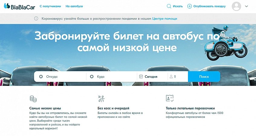 2020 har BlaBlaCar blivit världens största plattform för inte bara långa vägresor, utan även bussresor. Vid denna tidpunkt ingick företaget officiella avtal med många transportörer: Busfor, SKSauto, Slavyansky Express, Yugavtotrans, etc. Det kommer inte att finnas några problem med beställningen - välj de datum du behöver, riktningen och systemet kommer att välja det bästa alternativet . Det finns alltid många erbjudanden, plus att priserna för transport är bland de lägsta, som inte kan annat än glädjas. För att göra tjänsten ännu bekvämare och bekvämare erbjuder organisationen möjligheten att välja valfri plats när du köper en biljett, och låter dig också enkelt avboka en bokning eller göra ändringar. Tyvärr lämnar servicenivån mycket övrigt att önska och om något gick fel så kommer supporttjänsten med största sannolikhet inte att hjälpa dig.