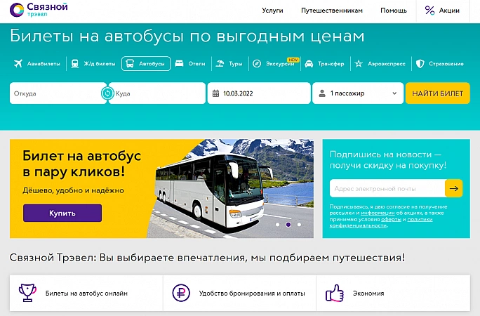 Svyaznoy Travel postar regelbundet kampanjkoder och arrangerar rabatter, på grund av vilka en biljett kan vara ännu billigare än direkt från transportföretaget själv.