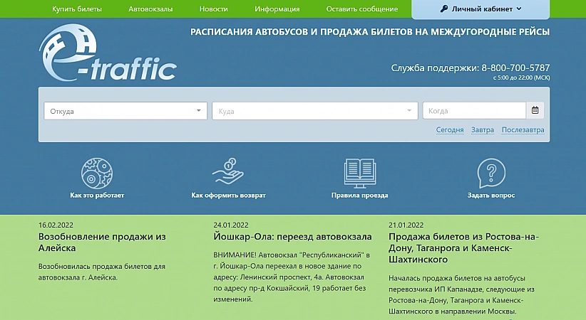 På E-traffic kan du köpa biljetter till valfritt antal personer, medan personuppgifter sparas efter registrering och du behöver inte ange dem igen. Dessutom, till skillnad från de flesta aggregatorer, kan du också betala bagageavgiften online på webbplatsen, vilket är mycket bekvämt.