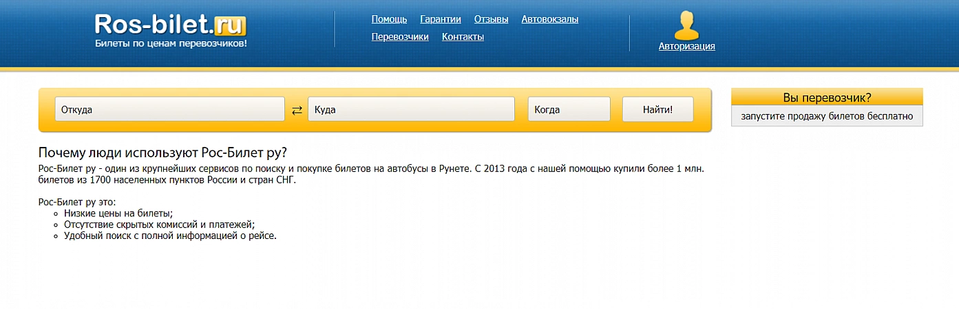 En av de bästa onlinetjänsterna för att sälja bussbiljetter i Ryssland. Samarbetar med 1500 transportörer och organiserar resor till alla hörn av landet.Uppdaterad information om datum för flygningen, kostnad och beläggning av kabinen finns på hemsidan - informationen uppdateras dagligen. Om något går fel kan du enkelt avboka din resa, men förlusten beror på när återbetalningen utfärdas. För förmedlingstjänster tar organisationen en provision på 7 % av kostnaden. När du gör en retur är den ej återbetalningsbar. Det största besväret är att elektroniska biljetter inte citeras överallt och det är bättre att skriva ut dem. Om du inte har en skrivare till hands måste du göra detta mot en avgift.
