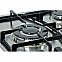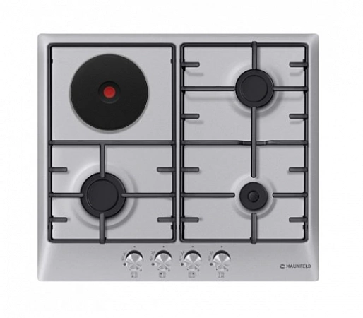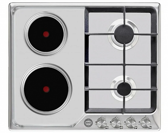 Den billigaste modellen från mellansegmentet med yta i rostfritt stål. Vid installation av hällen uppstår oftast inga problem. Modellens silverfärg ser diskret och snygg ut. När det gäller funktionaliteten är den utrustad med 3 gasbrännare och en elektrisk brännare i olika storlekar. Den elektriska kokplattan tillhör 3-kretstypen, vilket gör att du avsevärt kan påskynda tillagningsprocessen av rätter som kräver mycket tid att bearbeta. Bland fördelarna - elektrisk tändning och skyddande avstängning av gastillförseln när vätska kommer in i arbetsytan. Av nackdelarna kan det noteras att brytarna är för nära brännarna. På grund av detta blir de väldigt varma under tillagningen.