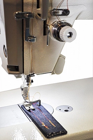 Enkelnålsmaskinen är utrustad med en gångfot som ger en stabil dubbelmatning av tyget.Den är designad för in-line-arbete med tunga material, läder, men det är svårt att konfigurera om det för olika tygtjocklekar. Man tillverkar markiser, stoppade möbler, textil- och lädersäten i bilar. Lämplig för tillverkning av tillbehör. Den syr smidigt, klarar sig tryggt med 6 lager konstläder, med cederträ. Dessutom ser sömmen snygg ut inte bara på den maximala sömmen på 8 mm, utan också på 4 mm. Tack vare gåfoten trycker den inte ihop påsen för mycket när den rör sig i området för punkteringspunkten. Detta har en positiv effekt på linjens kvalitet vid anslutning av flera lager av tjockt material. Den större spolen sparar arbetskostnader eftersom den kräver färre omgängningar i kroken.