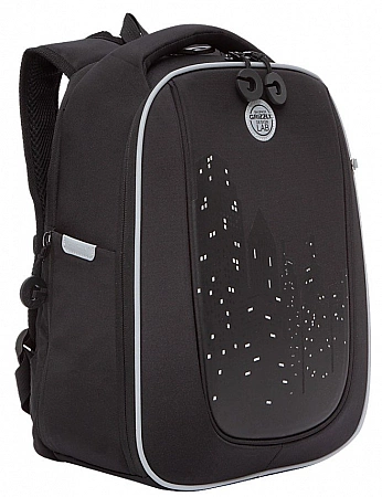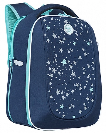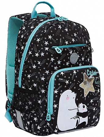 Skolväskan har en snygg, kortfattad design med stjärntryck, som definitivt kommer att tilltala en tjej med en drömmande natur.Formen på produkten är något förlängd vertikalt, den kompakta bredden överstiger inte bredden på barnets axlar, vilket uppfyller kraven för SanPiN. På ryggytan finns anatomiska utsprång som säkerställer ryggsäckens korrekta placering på ryggen. Bekväma vadderade axelband och en bröstrem säkerställer en jämn viktfördelning. På alla sidor av ryggsäcken finns reflekterande element som fungerar i mörker och ökar därmed barns säkerhet på vägen. Enligt programmet Grizzly Healthy Back/Backpack FITTING ingår en utbildningsbroschyr med förklaringar om förebyggande av sjukdomar i ryggradsapparaten i modellen.