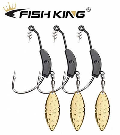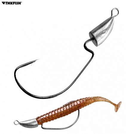 Offsetkrok av komplex design, som bäst används med silikonbeten, inklusive de lättaste. Den har sin egen viktning, som kan flyttas längs krokbenets hela längd. Det finns också någon sorts grannlåt.Det vill säga, själva tacklingen är redan ett bete och kan användas självständigt. Det är sant att det är svårt att bedöma fångbarheten hos sådan utrustning. Och designen är ganska svag. Om du stöter på en erfaren gädda eller gös med vassa huggtänder, kommer den troligen helt enkelt att bryta en komplex struktur, eller åtminstone bryta den. Detta är dock ett utmärkt alternativ för älskare av fiskeexperiment.