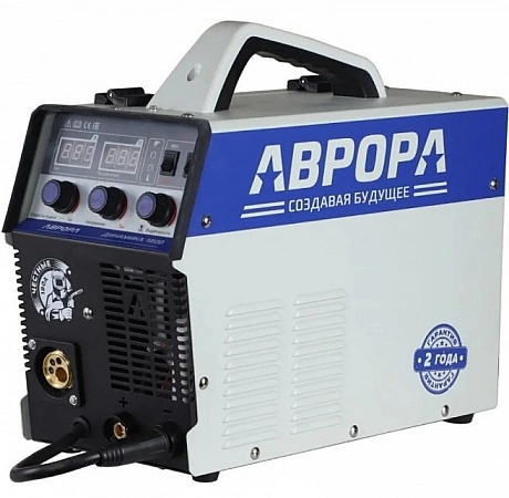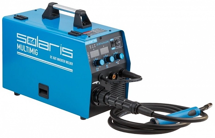 Multifunktionssvetsinverterare som kan MMA-, MIG/MAG- och TIG-svetsning, utrustad med synergisk styrning. Denna funktion, som gör att du automatiskt kan välja de optimala svetsparametrarna, kommer att vara användbar för nybörjare och professionella användare.Modellen är designad på basis av IGBT-transistorer, vilket säkerställer designens tillförlitlighet och smidig justering av prestanda. Ett effektivt forcerat kylsystem minskar risken för överhettning. Det bör noteras att TIG-svetsning endast är tillgänglig för användare med likström. Också nackdelarna med ägarna inkluderar den låga kvaliteten på tillbehören som följer med den halvautomatiska.