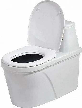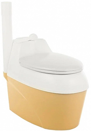 Relativt kompakt och praktisk, den torrspolade komposttoaletten fångar omedelbart ögat med sin autentiska design. Den liknar mest en vanlig toalett, så den sticker inte ut från insidan på installationsplatsen. Fodralet är tillverkat av slitstark plast och tål minst 100 kg belastning på toalettstolen. Sitthöjden är 40 cm, vilket gör att denna torra garderob kommer att vara bekväm för både vuxna och barn. Men personer med ömma leder kommer inte att vara så bekväma att resa sig från det, och detta kan anses vara en nackdel. Ventilationsröret måste installeras innan toaletten används. Det bör noteras relativt liten vikt - endast 6 kg. På grund av detta är modellen enkel att transportera med dig och använda, även på turistparkeringar.