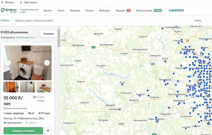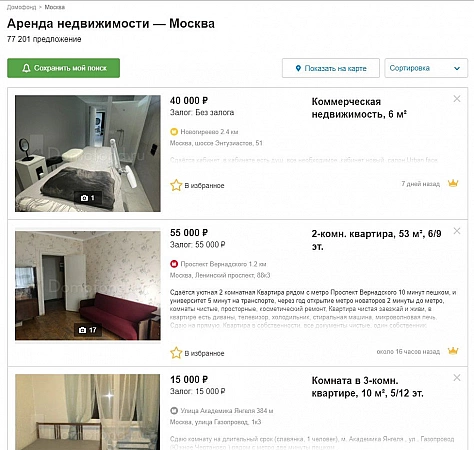在俄罗斯房地产经纪人协会的支持下创建了一个大型在线平台,通过从开源、专业中介和个人收集信息来提供最大范围的报价。实时解析数据并分析相关性和完整性。定价政策是忠诚的,您可以在莫斯科郊区租一个房间的最低金额是 6500 卢布。值得注意的是,广告存档六个月,申请人可以追溯特定对象的历史和不同代理商的租金成本。要找到合适的报价,只需在地图上标记关键参数或突出显示某个区域的地理位置即可。