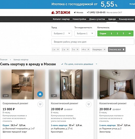 最古老和最有经验的房地产公司之一“Etazhi”在俄罗斯和国外的 168 个城市 - 只有 7 个国家。它拥有超过 17,000 名员工,他们的高素质使他们能够在几个小时内完成客户设定的任务。在市场上的长期存在以及与对象的直接所有者的合作使该机构能够提供莫斯科和莫斯科地区租金最低的公寓 - 起价 15000 卢布。要为所有重要参数选择此类选项,使用站点上的过滤系统就足够了。广告的相关性和可靠性检查无误,检查结果可以在公寓卡中找到。唯一的“但是”是目录中的出租房屋报价很少。