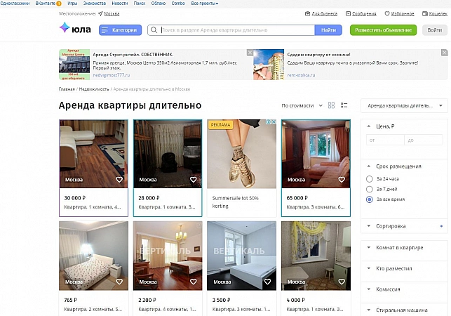 高级地理定位、P2P 音频和视频通话、阻止不需要的电话的系统、仅通过聊天设置联系人或对话时间的能力 - 这远不是 Yula 网站向百万分之一用户提供的完整功能列表. Mail.ru Group 的创意是 Avito 的直接竞争对手,它被认为是技术最先进的项目,每月访问量超过 2500 万次。他们所在地区的业主经常通过其公告板放置公寓,因为默认情况下它会显示 100-150 公里半径内的地址。莫斯科的租金从 5,000 卢布开始,但您需要小心 - 网站上有很多不道德的中介。