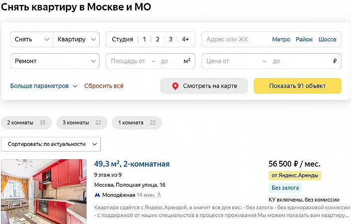 互联网巨头 Yandex 推出了一项新服务,让您可以长期租用公寓,并且永远不会与业主见面。租赁的所有阶段——从选择和检查到登记——都是在网上进行的。该服务的员工是租赁领域经验丰富的专家,他们自己拍摄专业照片,收集有关基础设施的信息,并可以详细描述每个对象。值得注意的是,网站上显示的月租金额为最终金额,已包含保险金,交易主体可以指望和平解决意外情况。因此,该服务极大地简化了在莫斯科寻找合适公寓的过程,但不适用于整个莫斯科地区,也无法提供大量选择。