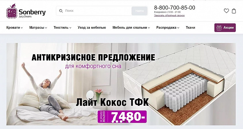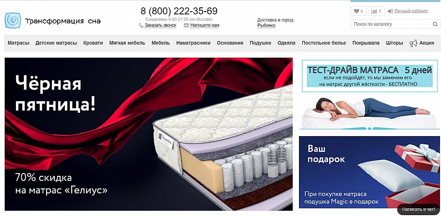 这是一家在线商店,您可以在这里找到来自俄罗斯和外国品牌的睡眠产品。该目录包含 1000 多种型号的床垫和 500 多种类型的床。如果您需要帮助,商店经营者会迅速帮助您找到最佳选择。同时,在购买床垫时,提供试驾——5天内您可以测试模型,如果不适合您,公司将免费更换为不同硬度的产品。 Sleep Transformation 商店可以安排送货到俄罗斯的任何地区,但这可能需要相当长的时间。买家抱怨他们没有提前警告最后期限的失败,他们必须自己打电话找出原因。