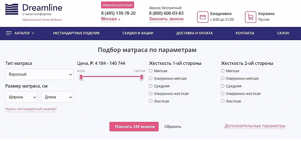 DreamLine 提供种类最多的睡眠产品等。在这里您可以找到:枕头、毯子以及沙发、桌子、五斗柜、纺织品和其他产品。如有需要,我们会根据您的体型为您制作床垫或床铺。在网上商店中导航非常简单:所有产品都分为类别,有过滤器便于搜索。根据客户评价,DreamLine 产品质量上乘,经久耐用,价格也不高。尽管存在一些缺点,但他们注意到交付时间的中断,而且支持服务的工作并不总是及时。